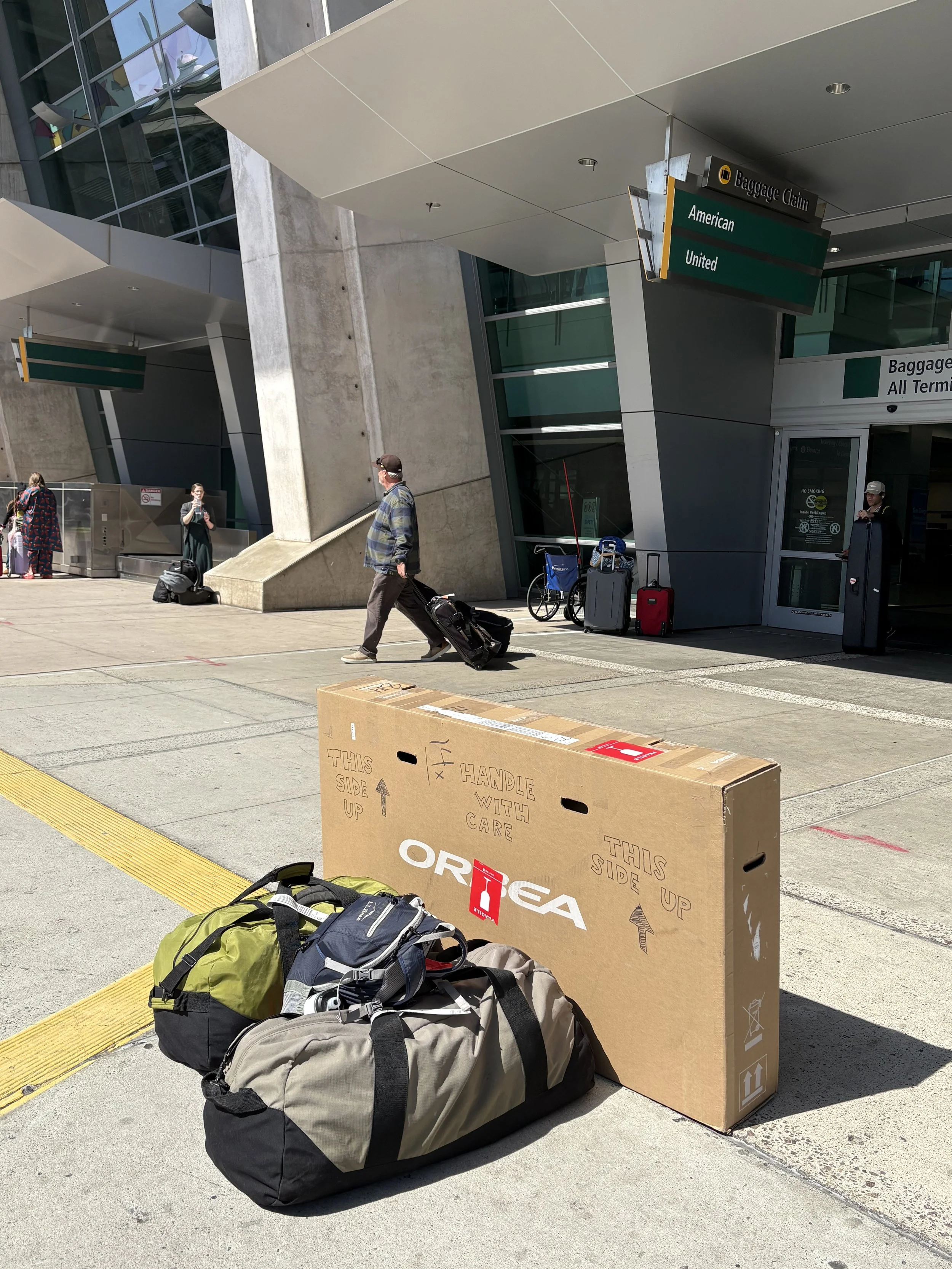 Bike and bags outside Terminal 2 at San Diego airport.