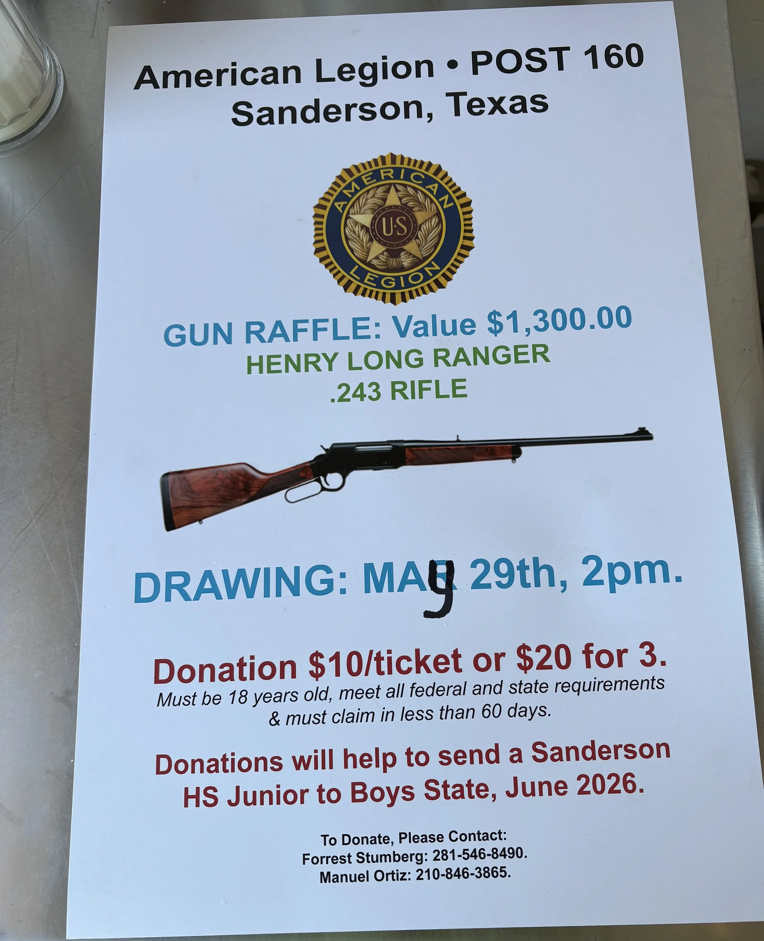 Only in Texas, raffle a gun to send a Sanderson HS Junior to Boys State. (Note: I went to Boys State in 1975)