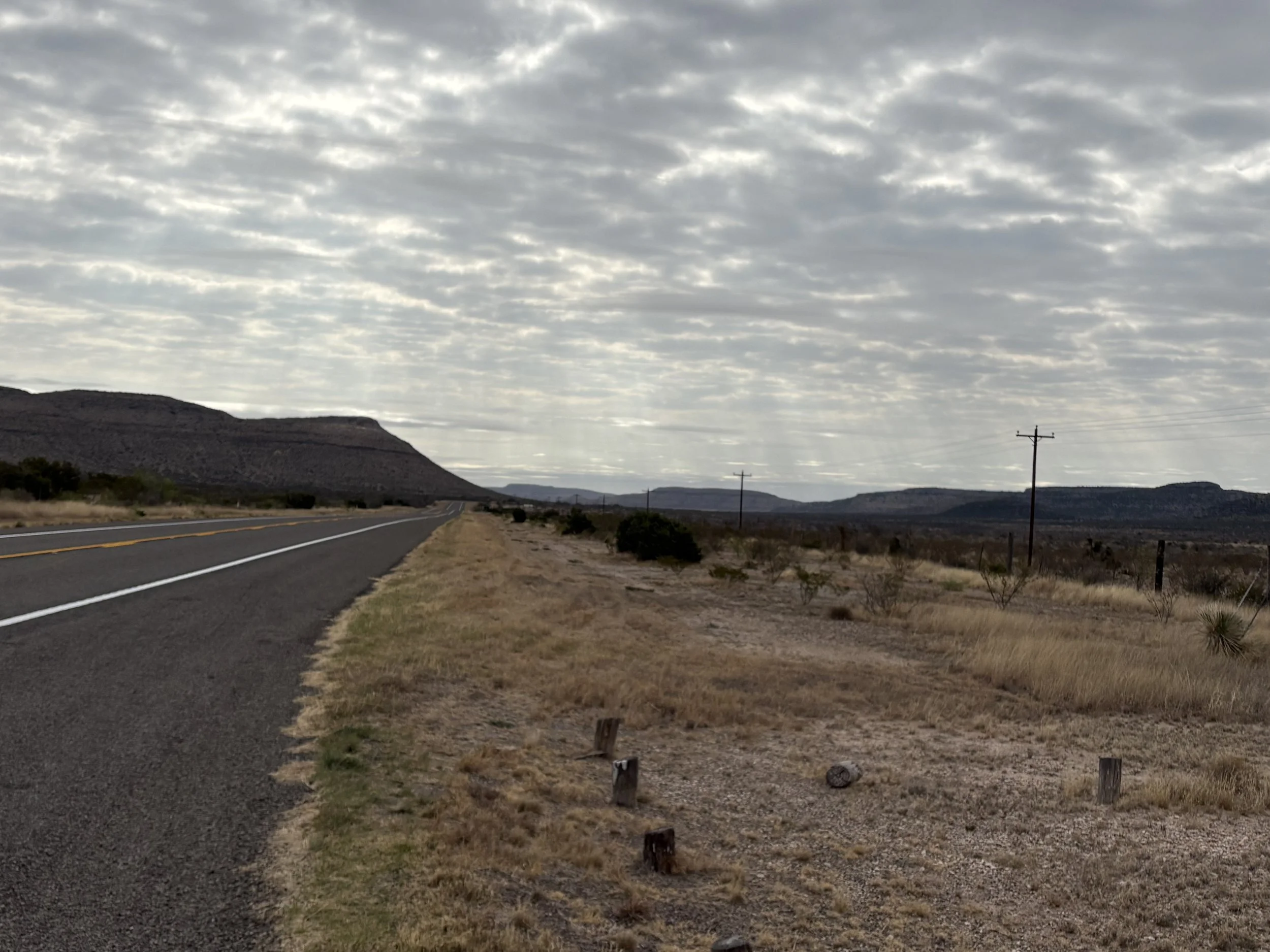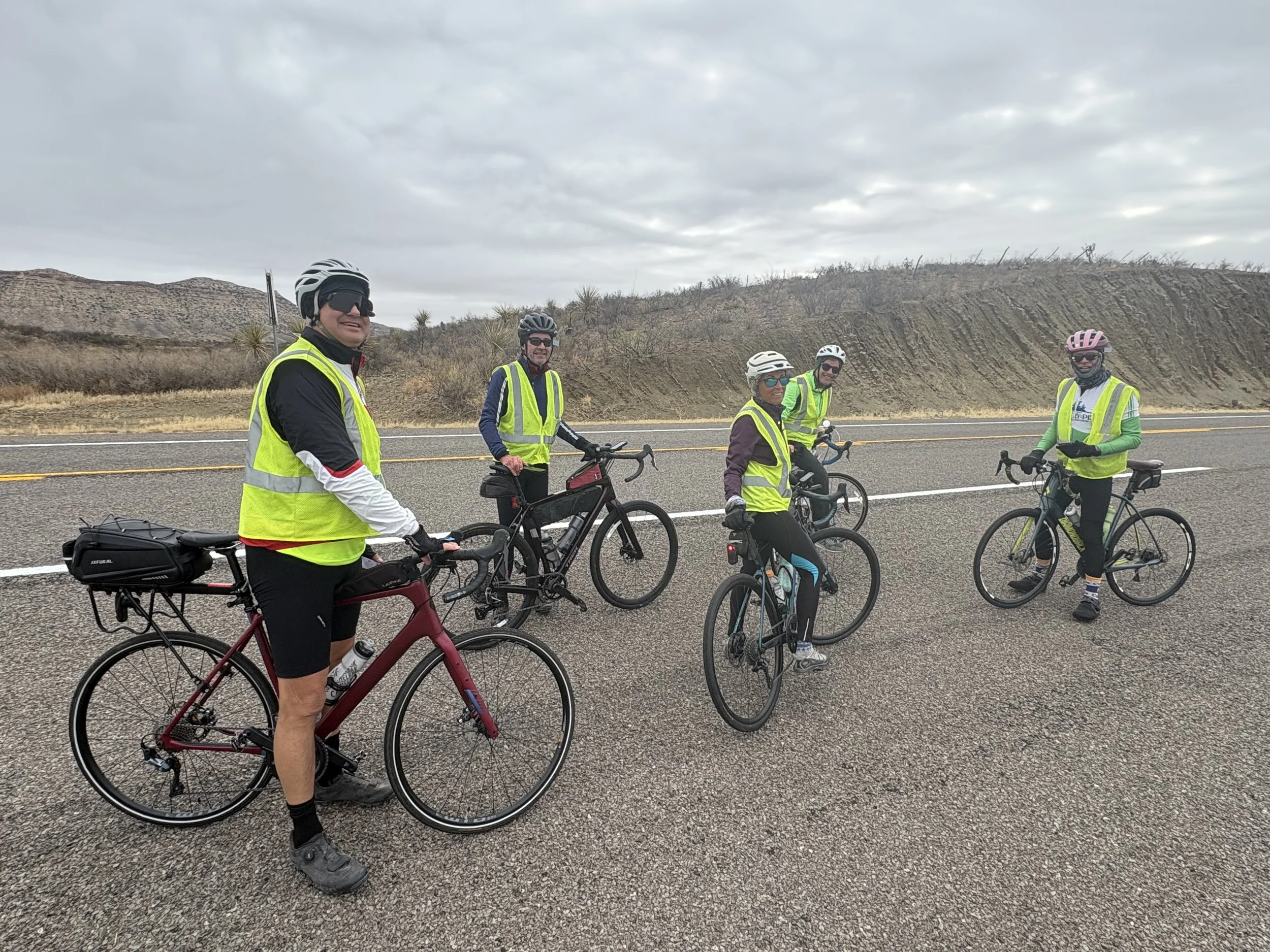After yesterday’s high winds, the resulting front has changed the weather. Gloves, hats, tights, and a heavier jacket were needed for the low 40’s in the morning with overcast skies. By the time we reached Sanderson, blue skies and comfortable temperatures were prevalent. Pretty scenery today, some headwinds, and downhills into Sanderson. Fun riding day. Sleeping in the gym at Sanderson HS.