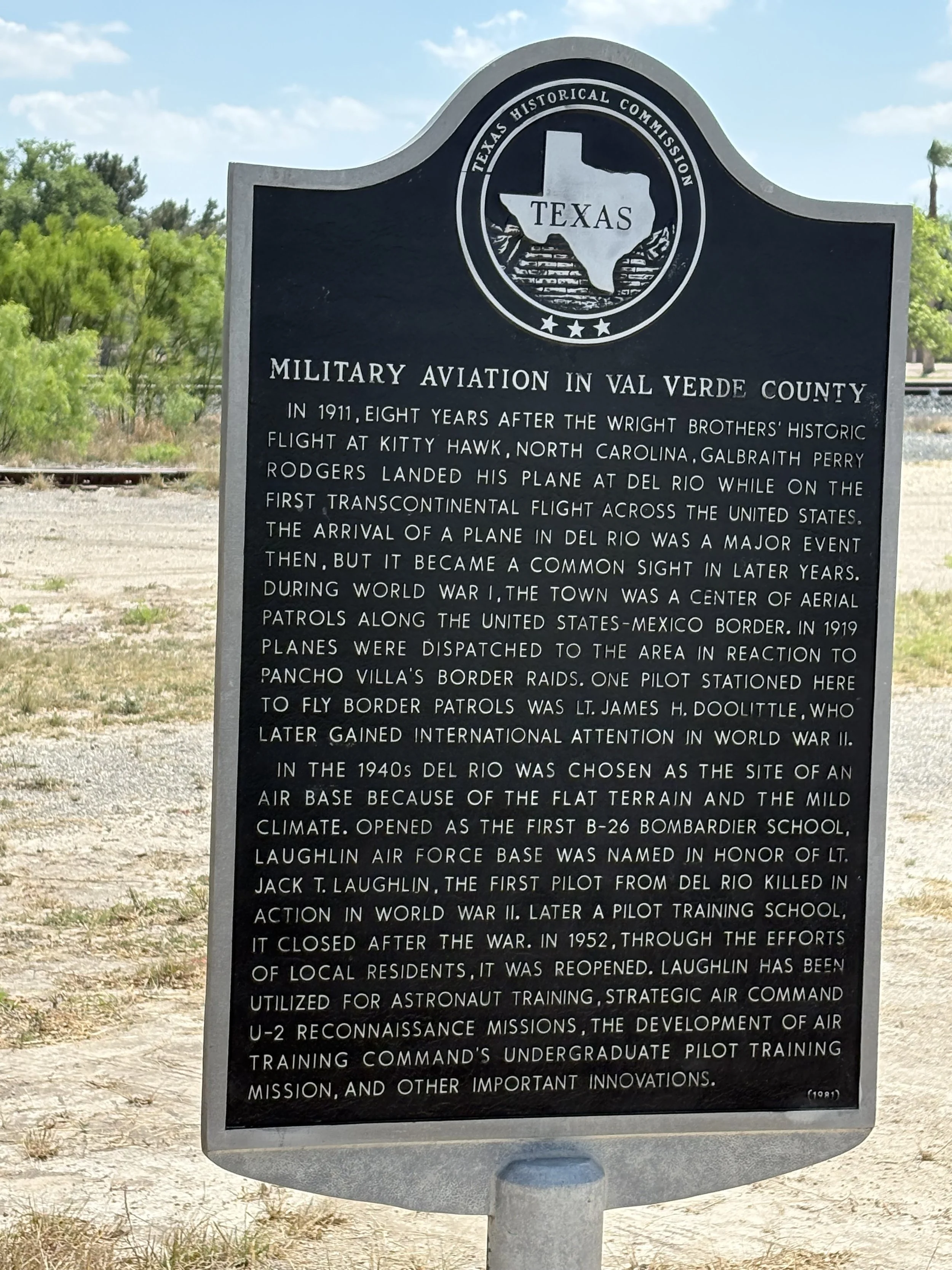 Mileage marker describing Military Aviation history of Del Rio.