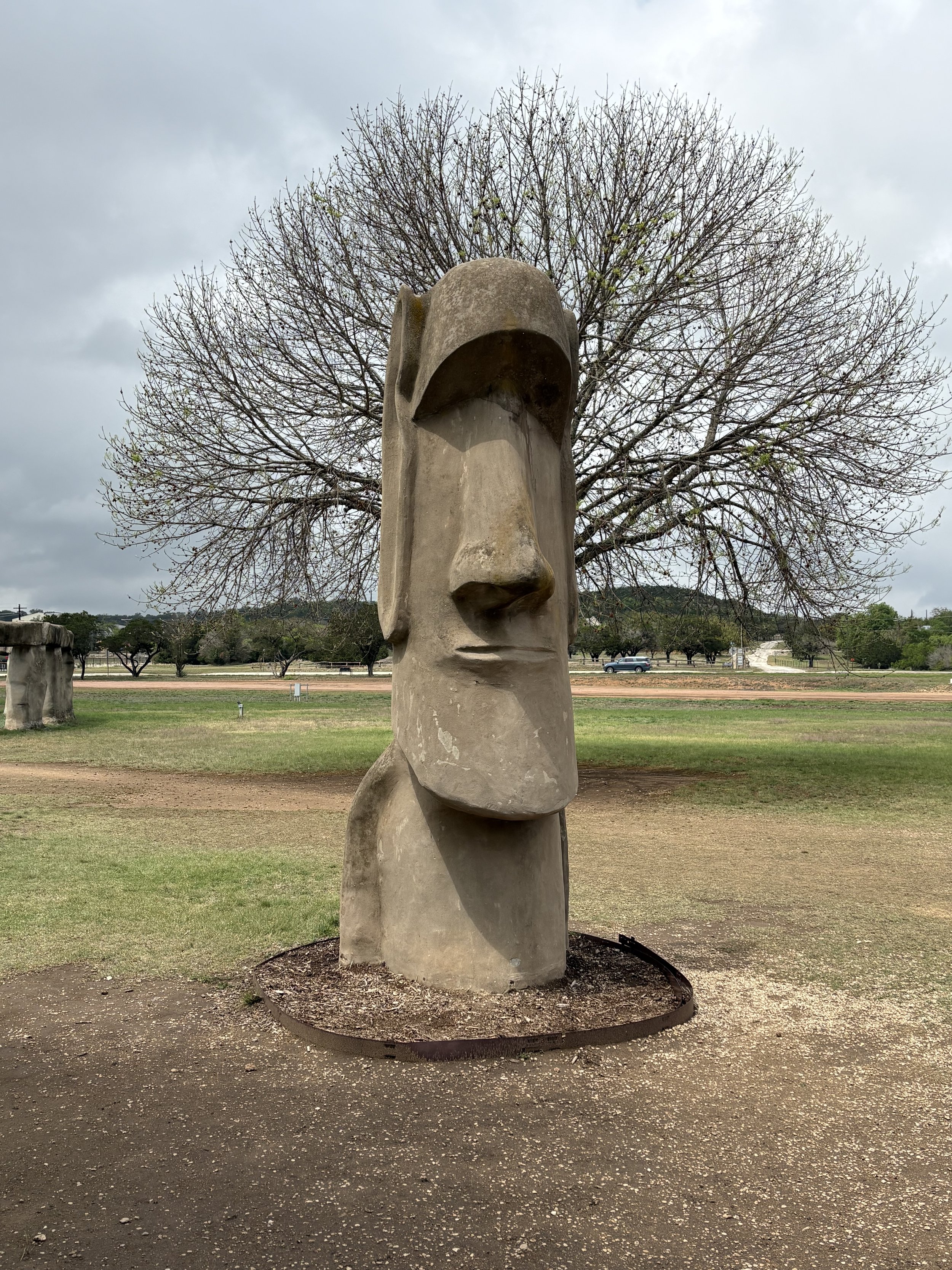 Sculpture at Stonehenge II at mile 63. Camera angle makes tree appear as “hair”.