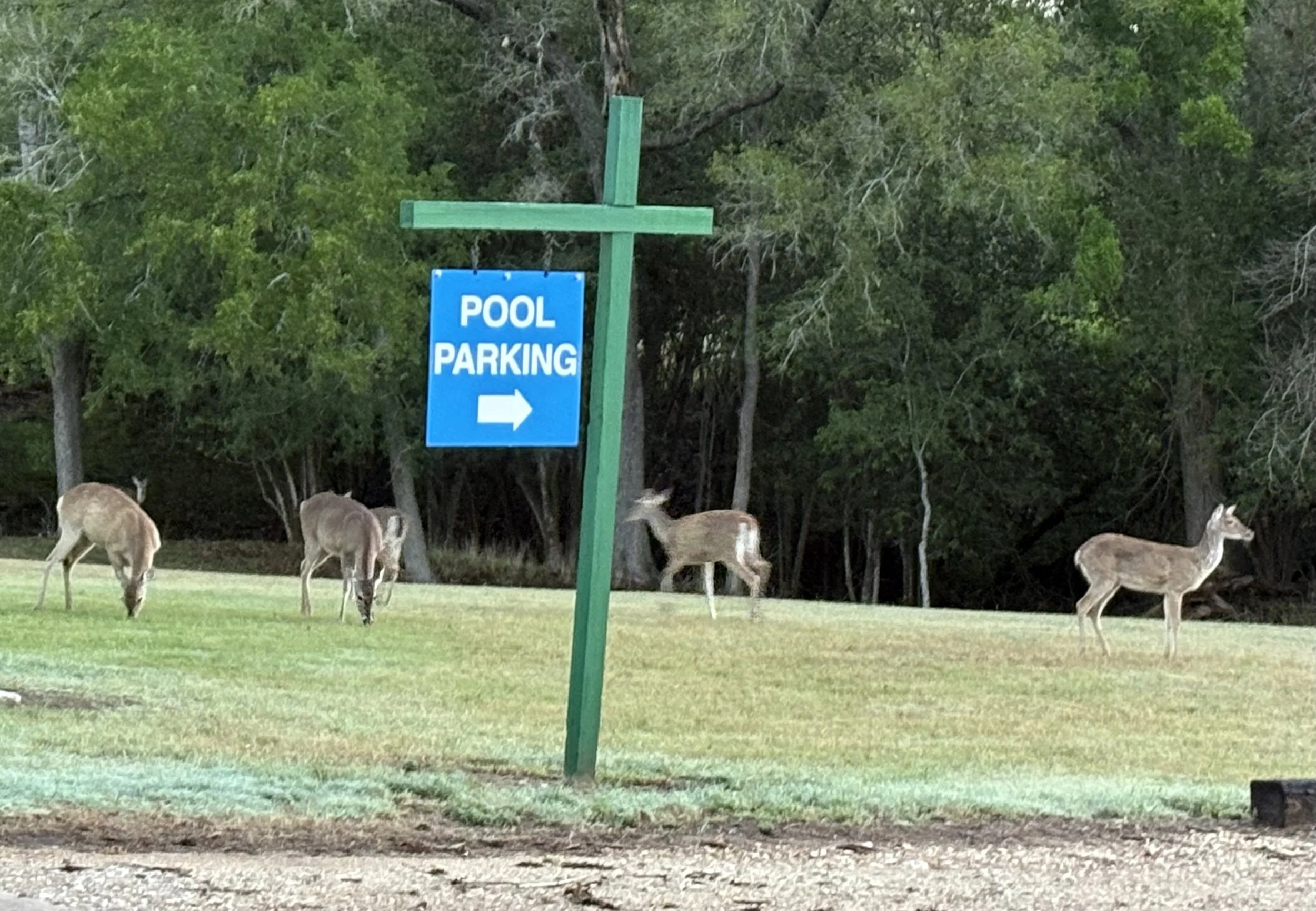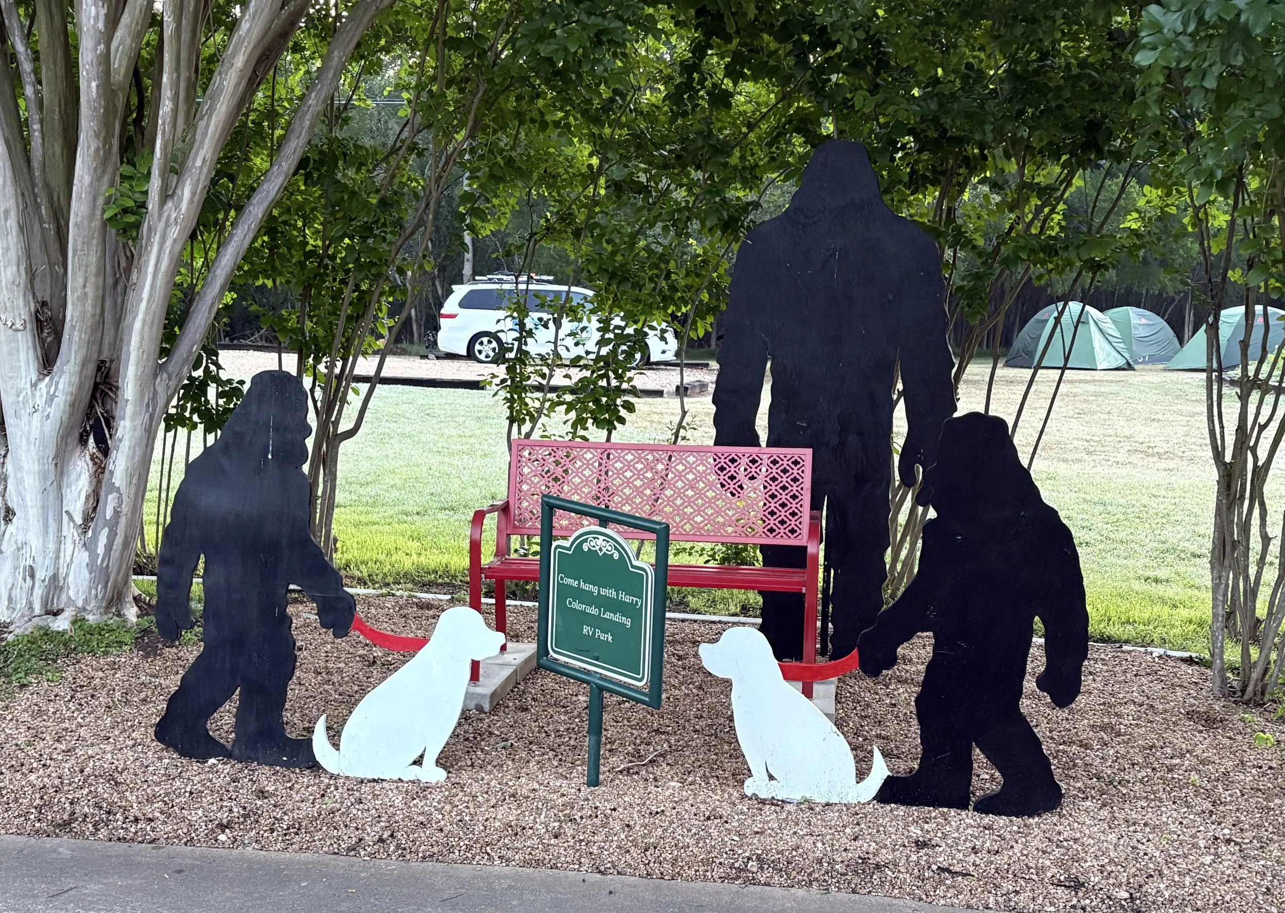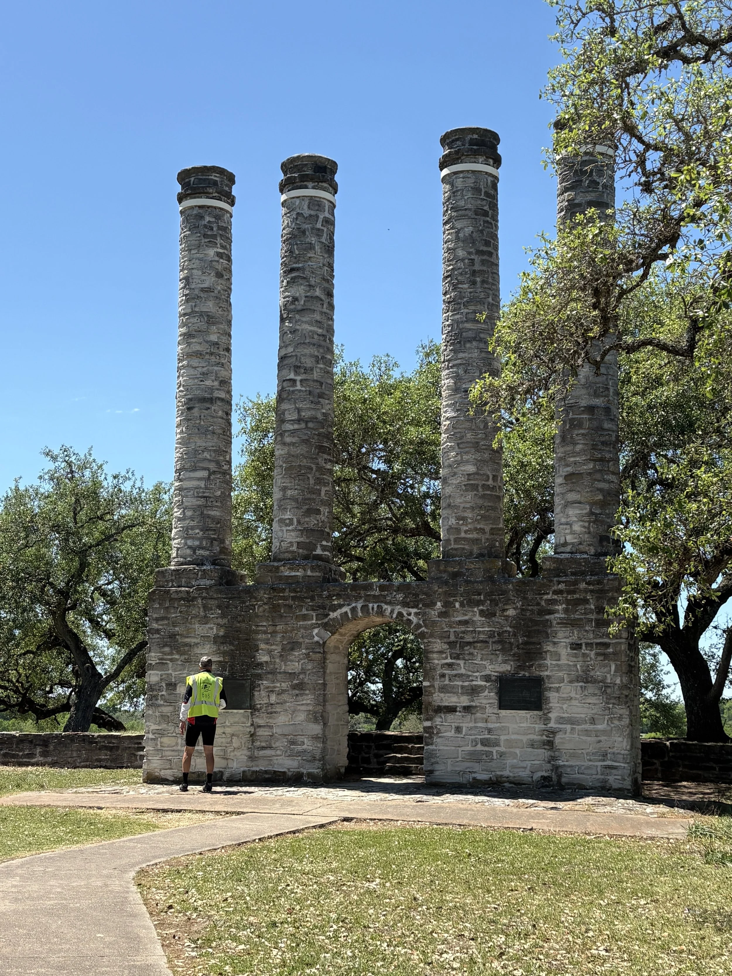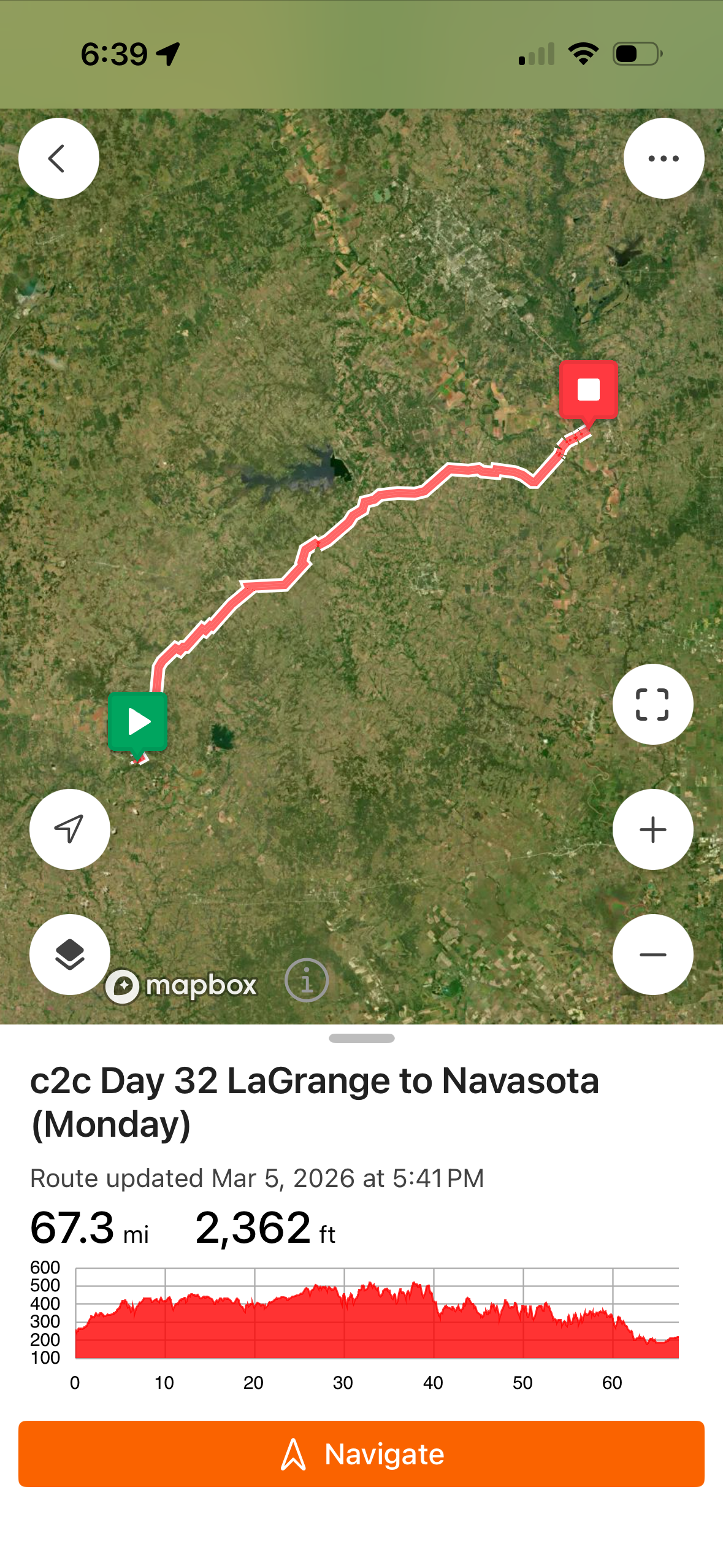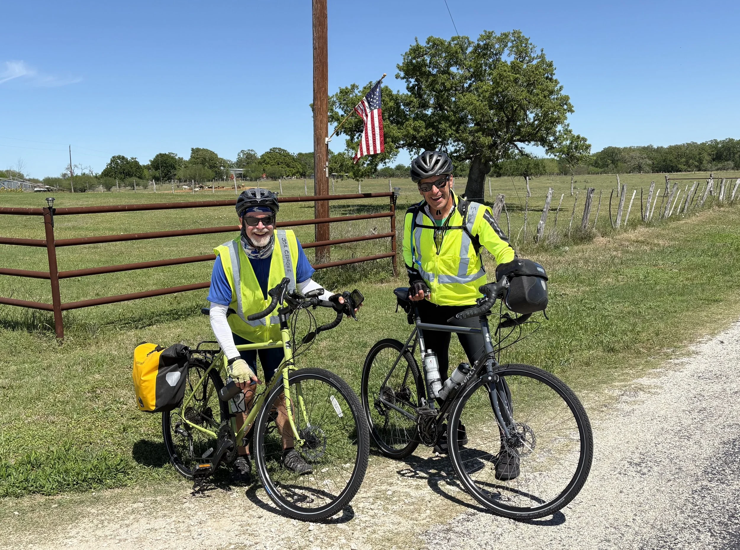 Beautiful riding day, cool temperatures and sunny weather….and headwinds. At the 7 mile mark, a washed out bridge created a logistics problem. Turns out the bypass was on beautiful roads, and added “only” 5 extra miles to our total. Lots of interesting sights today, the original site of Baylor University, cattle farms, ranches, and lots of open space, and even an animal refuge with zebras. Tonight we’re staying at Airport Landing RV Park in Navasota. BTW, place is new, shower facility not built. We showered at the Circle T Truck Stop….a first for me.