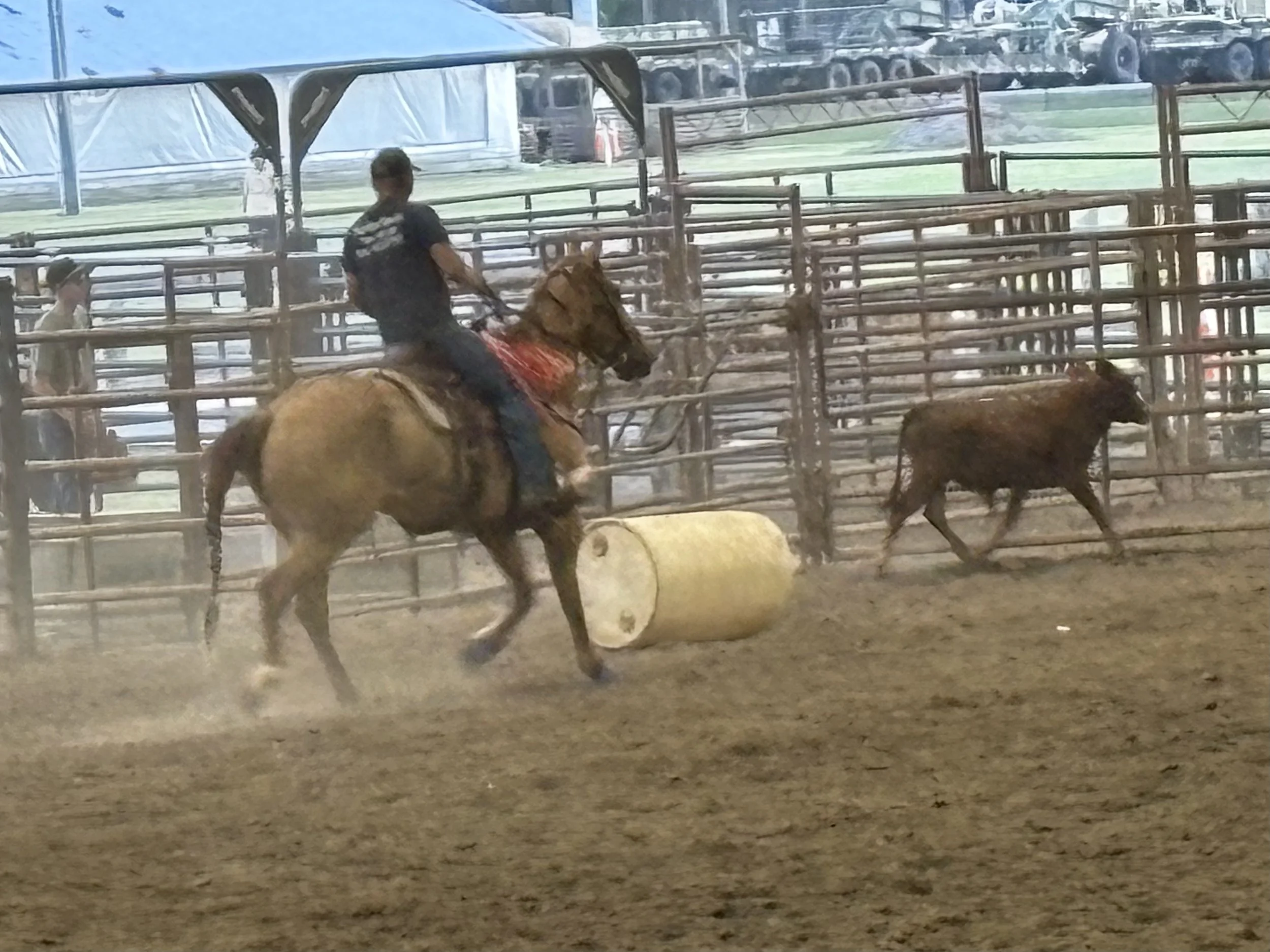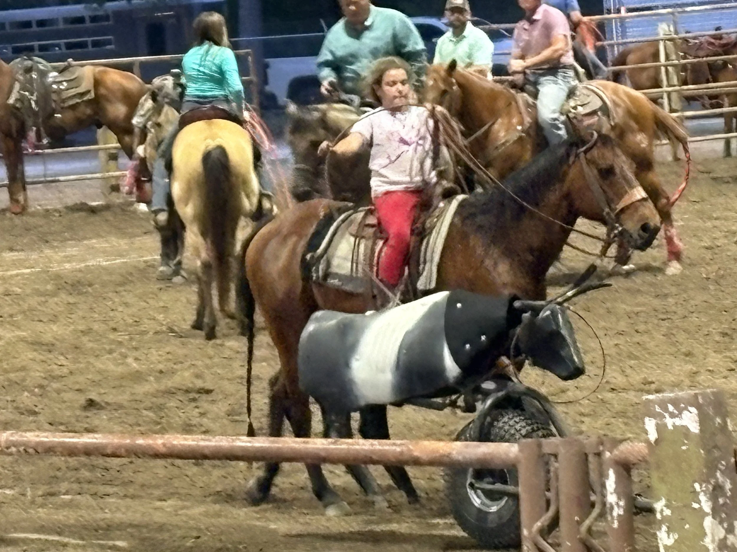 In a nearby building to our campsite, cattle rustling by local towns people was happening. Here, a young girl competes in the “dummy cow” competition.