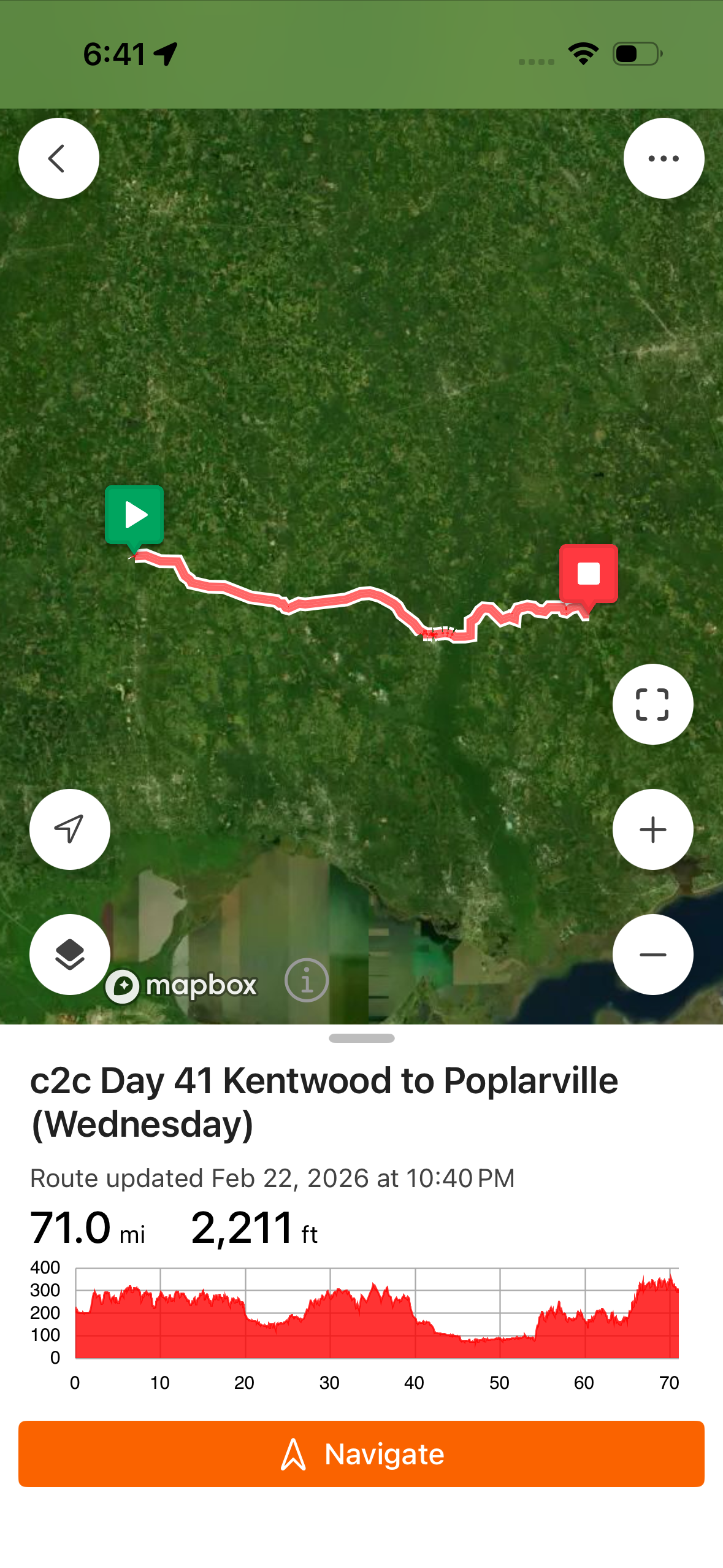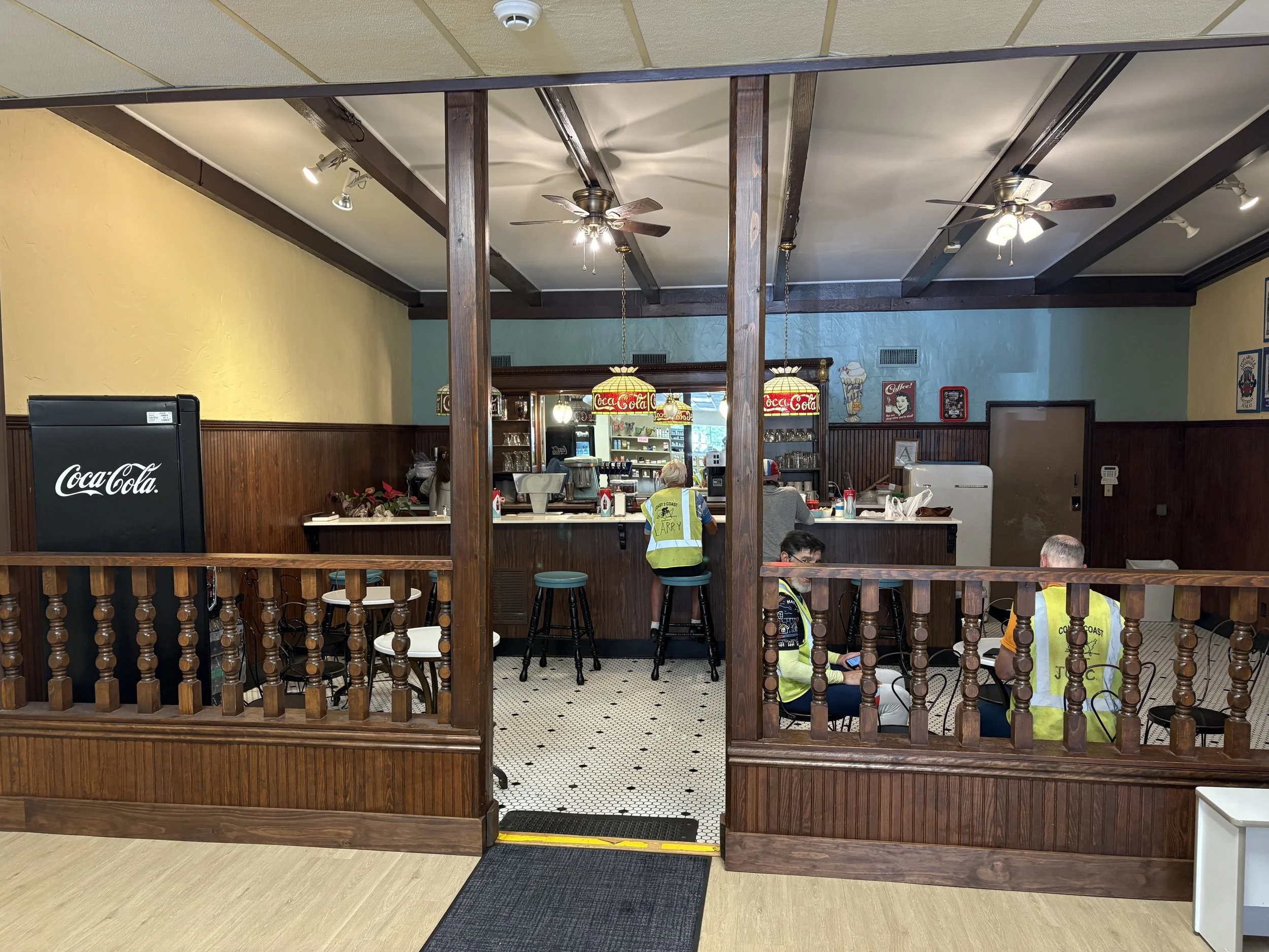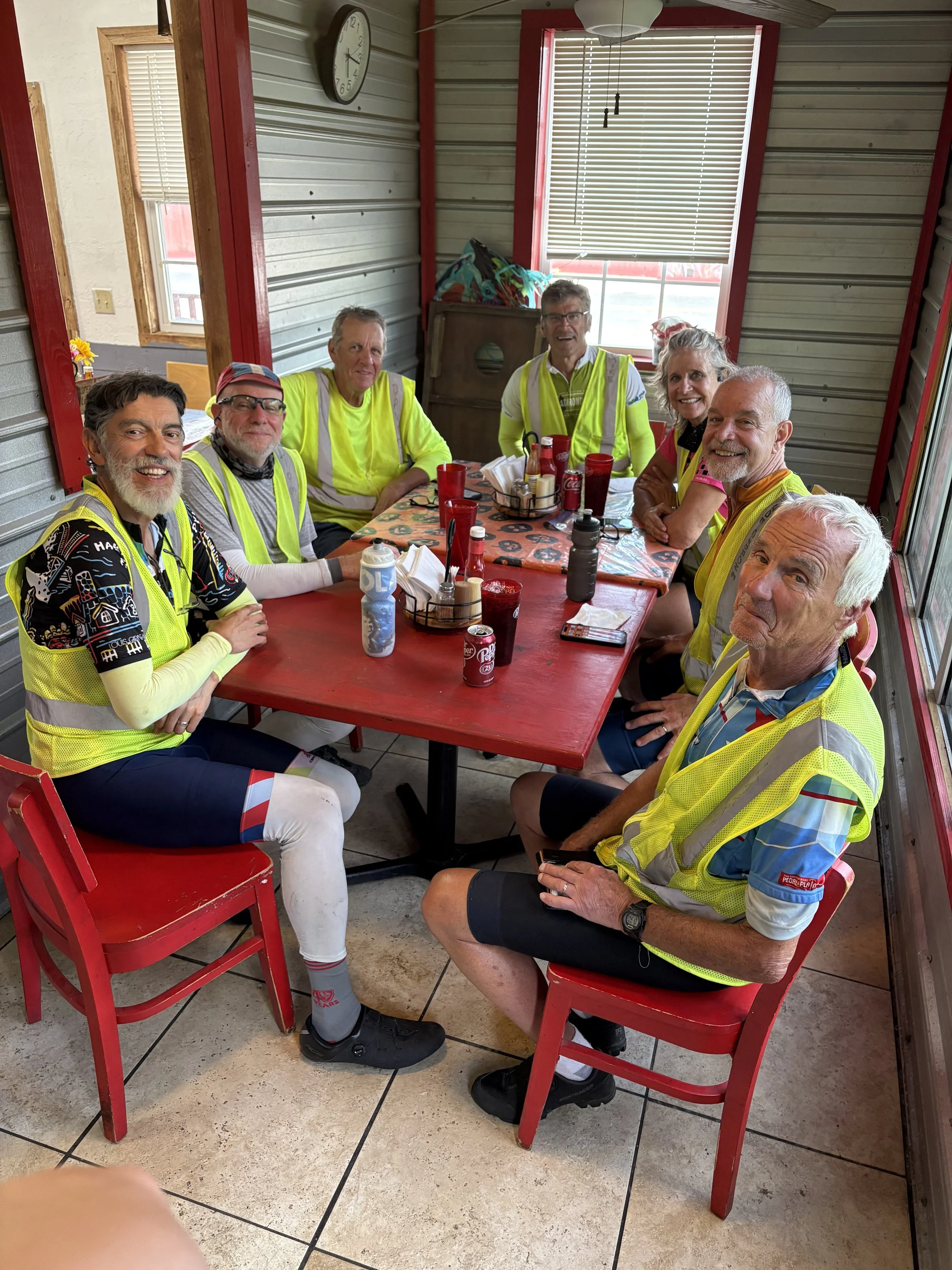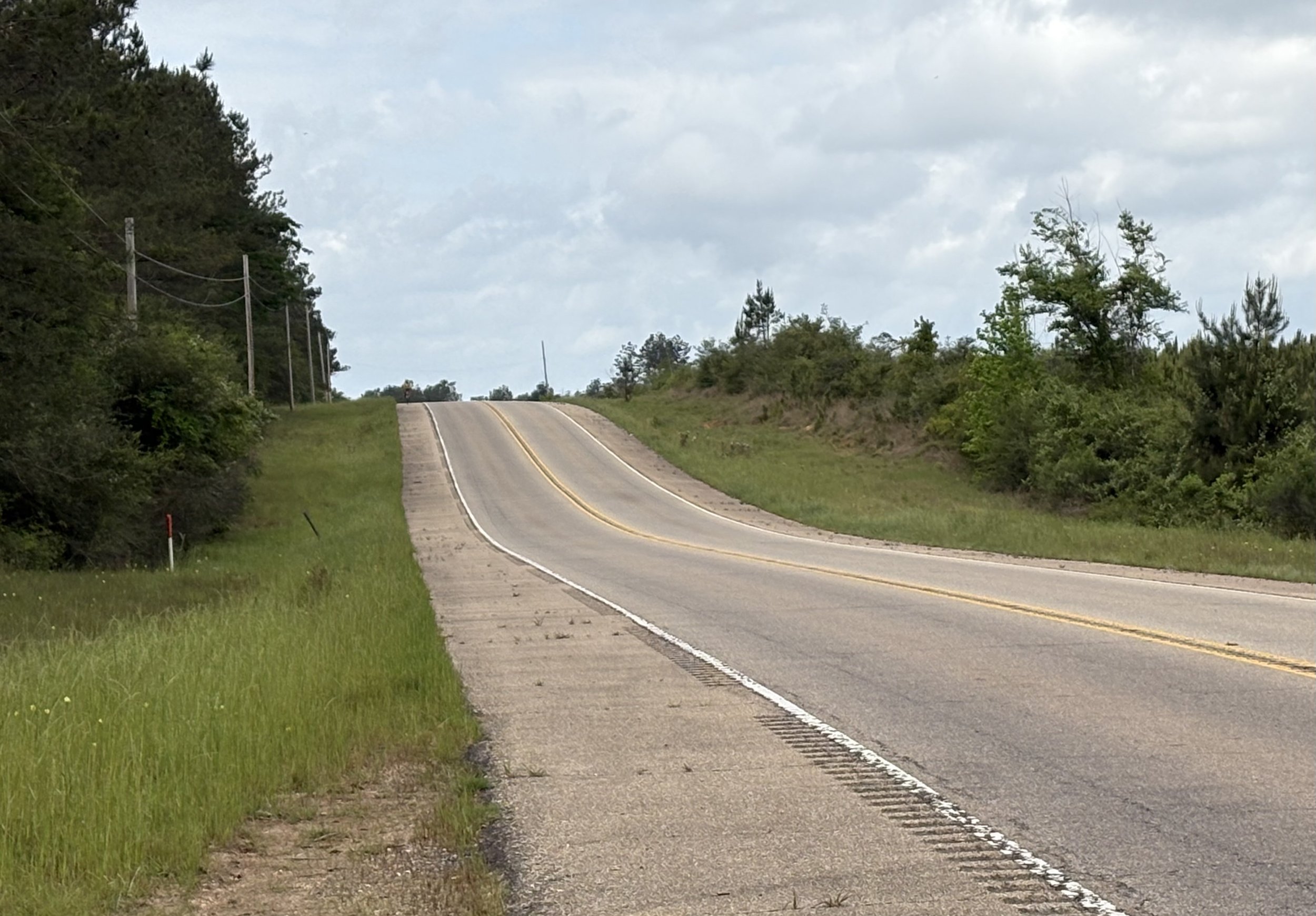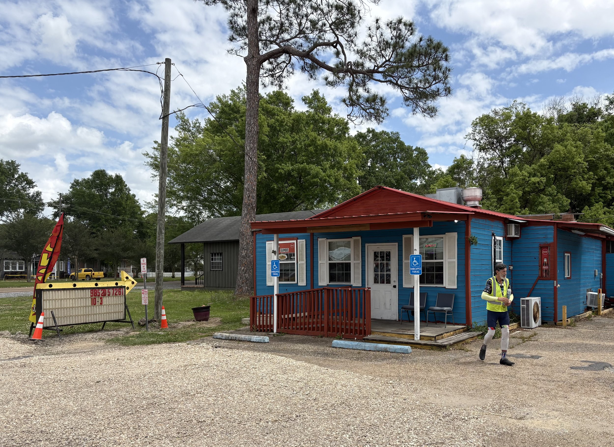 Great biking day, Welcome to Mississippi. Fog in the morning. Rolling hills, nice roads, no rain, light winds. Great food stops at Sugar Shack (donuts), Elaine’s Diner (chicken po’ boy), Pearl River Drugs (ice cream).