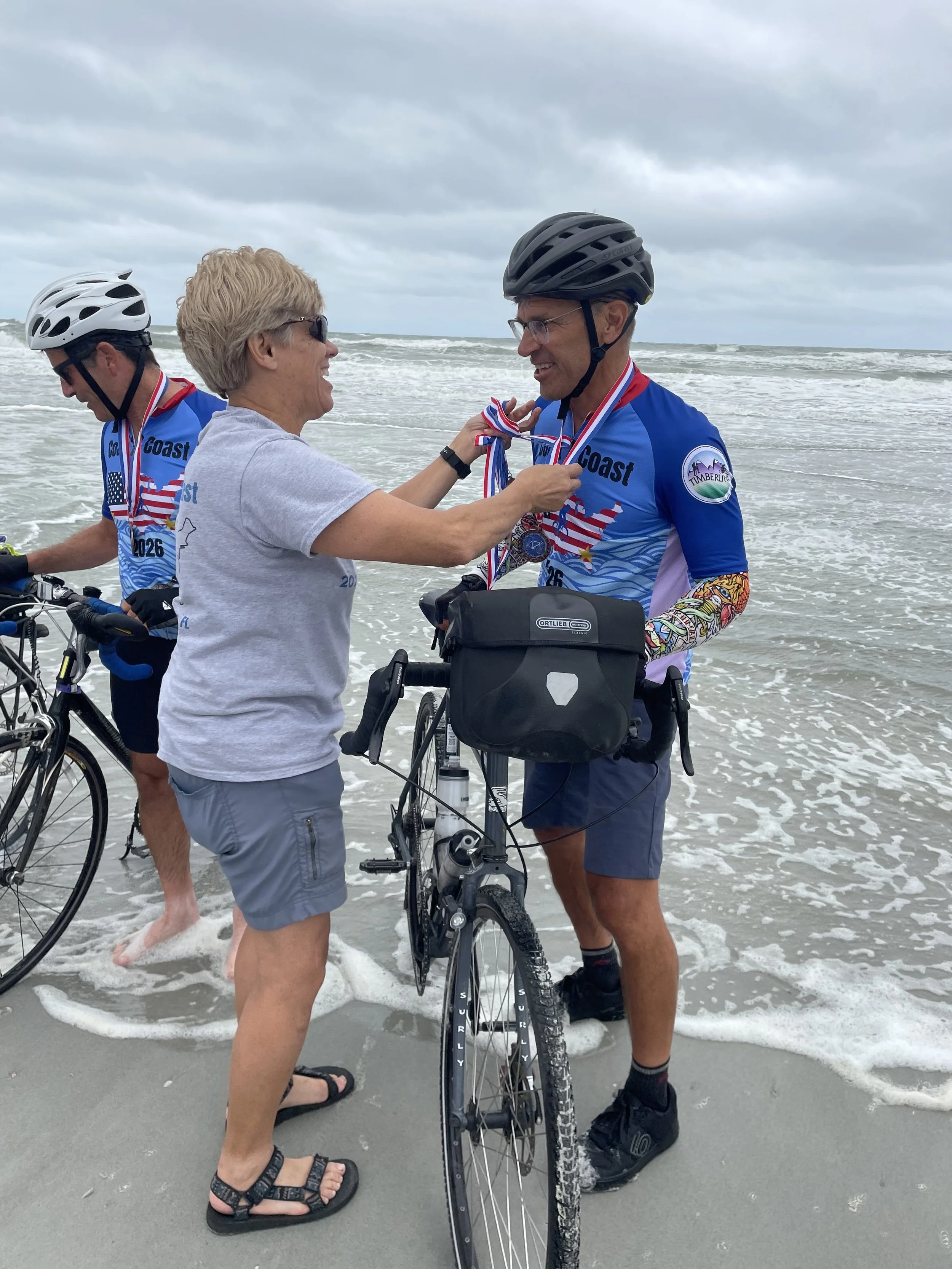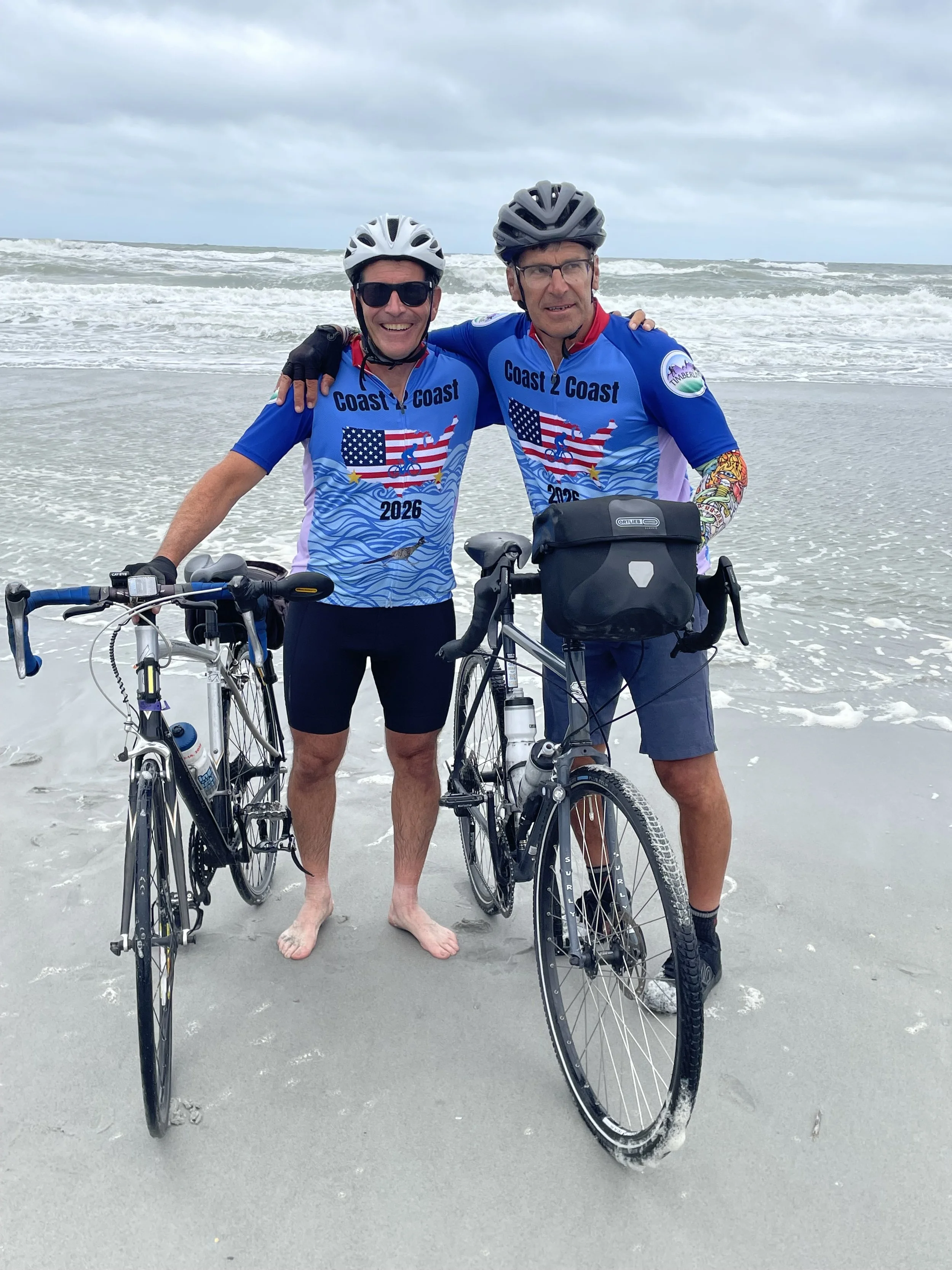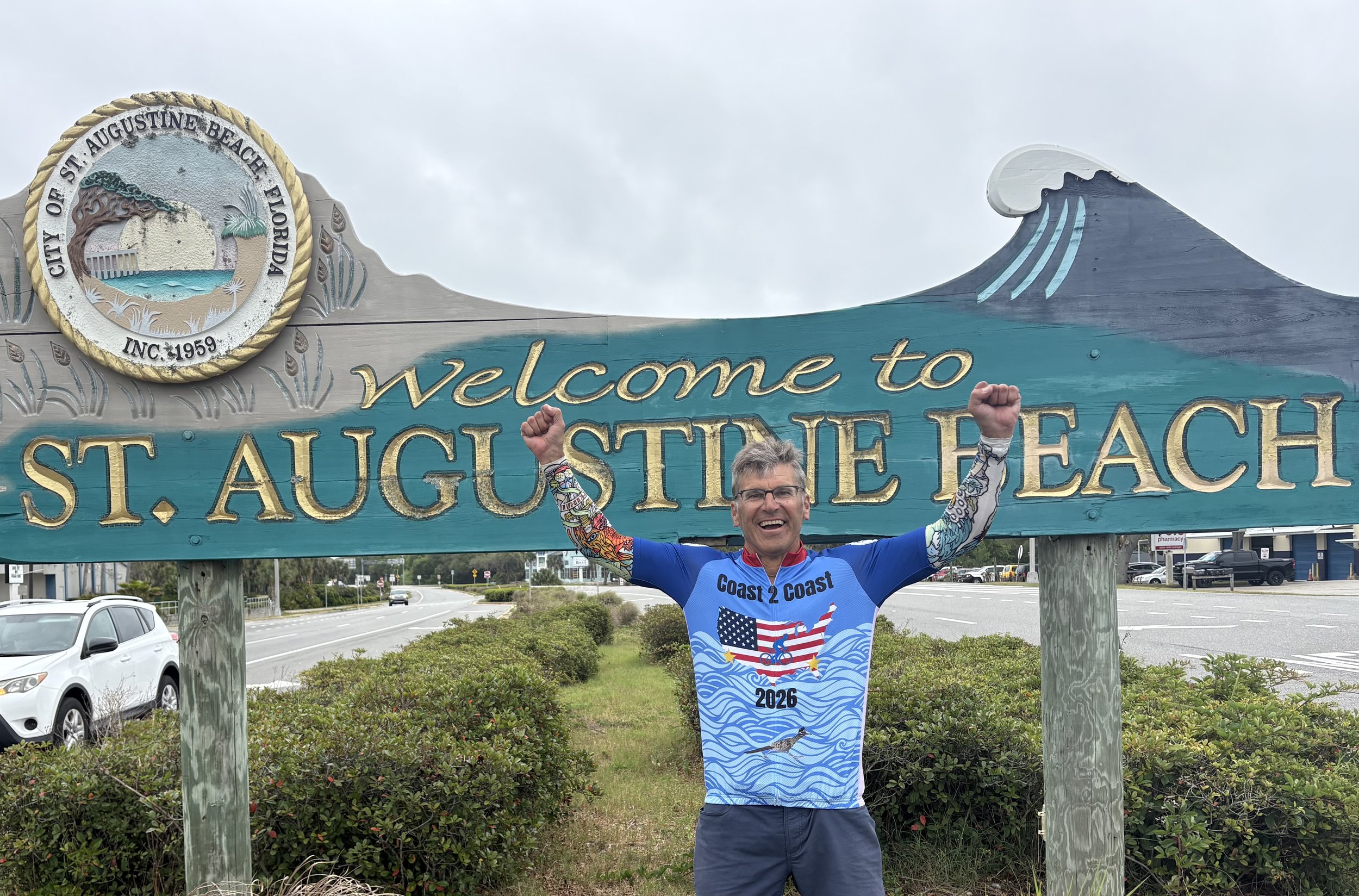 What an amazing day, the last day of this cross country adventure. After a leisurely breakfast at the hotel, the riders took pictures in their new custom jerseys, and then rode 10 miles to eat donuts at the first SAG. 20 miles later was lunch in St Augustine. 3 miles later, more pictures at the St Augustine sign. Lastly, we rode 2 miles to a loud cheering crowd at St Augustine Beach to complete the mission. Later, the riders and family members: friends met for a great final dinner. Ov we all, a very fun day.