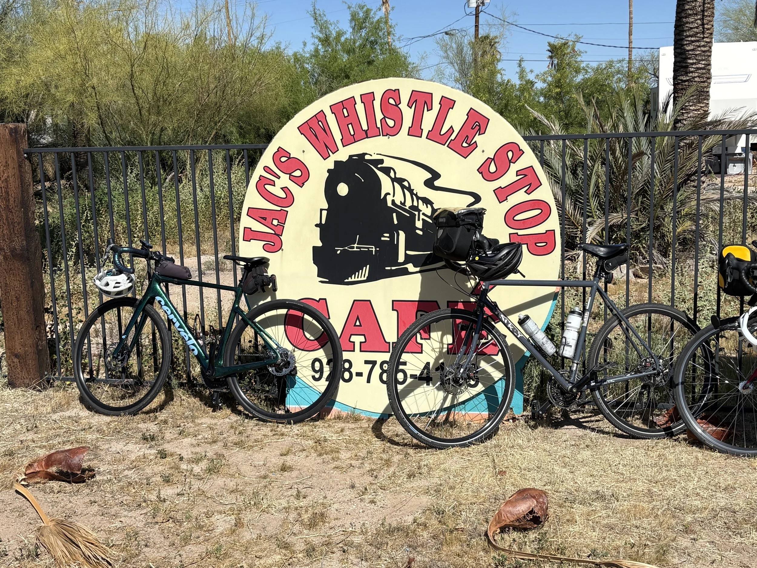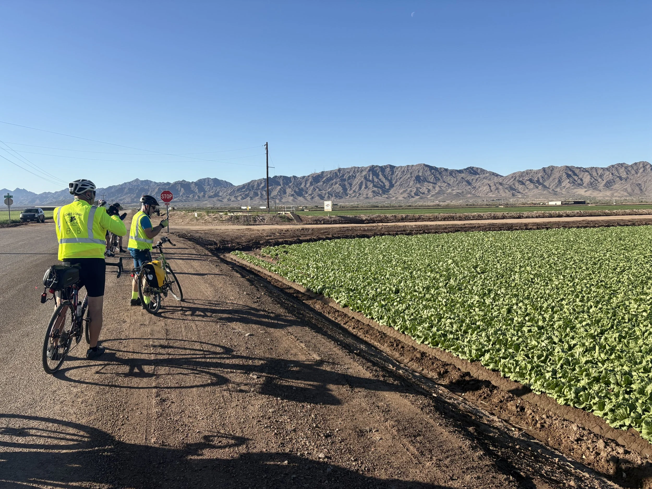For the first time on this tour, we had a slight tailwind. I was starting to really question whether the “West to East prevailing winds” really exist. (The jury is still out). We enjoyed riding through the agricultural valley by the Fortuna Foothills outside of Yuma. Fields of lettuce (several types), kale, cabbage, and broccoli were abundant. Towns along the route included Wellton and Tacna before arriving in Dateland, where we are camping (first time) at the Dateland RV Park.