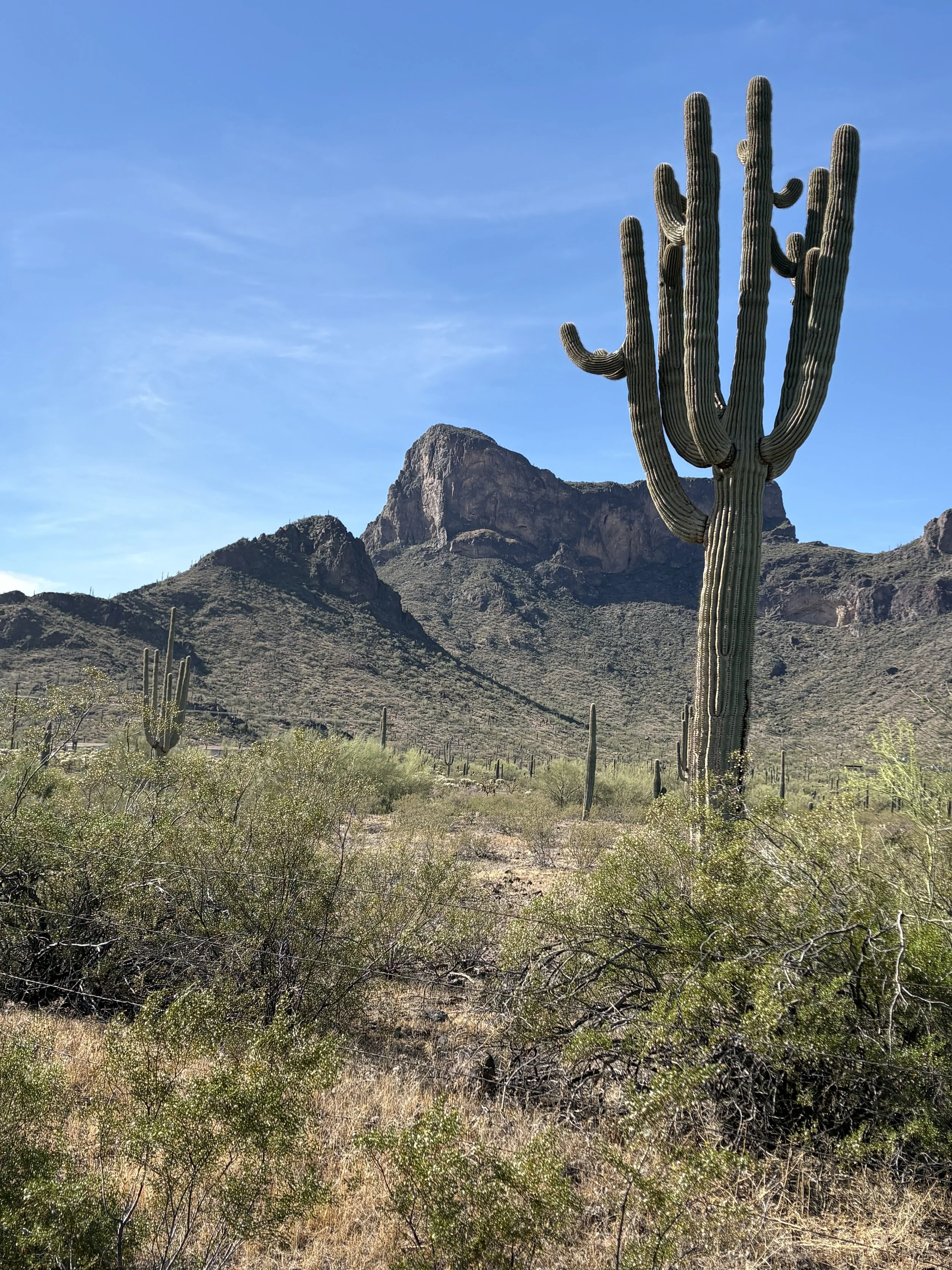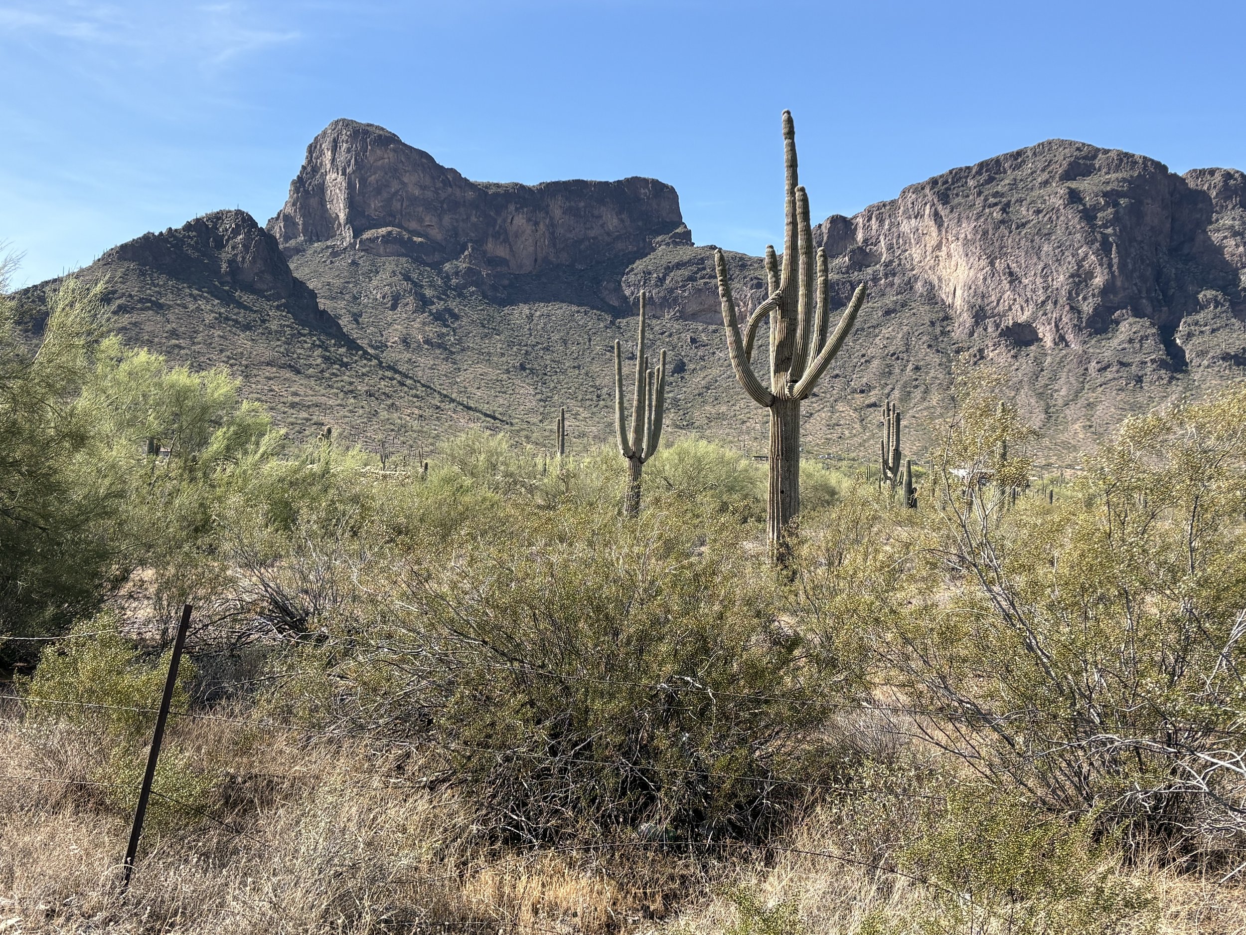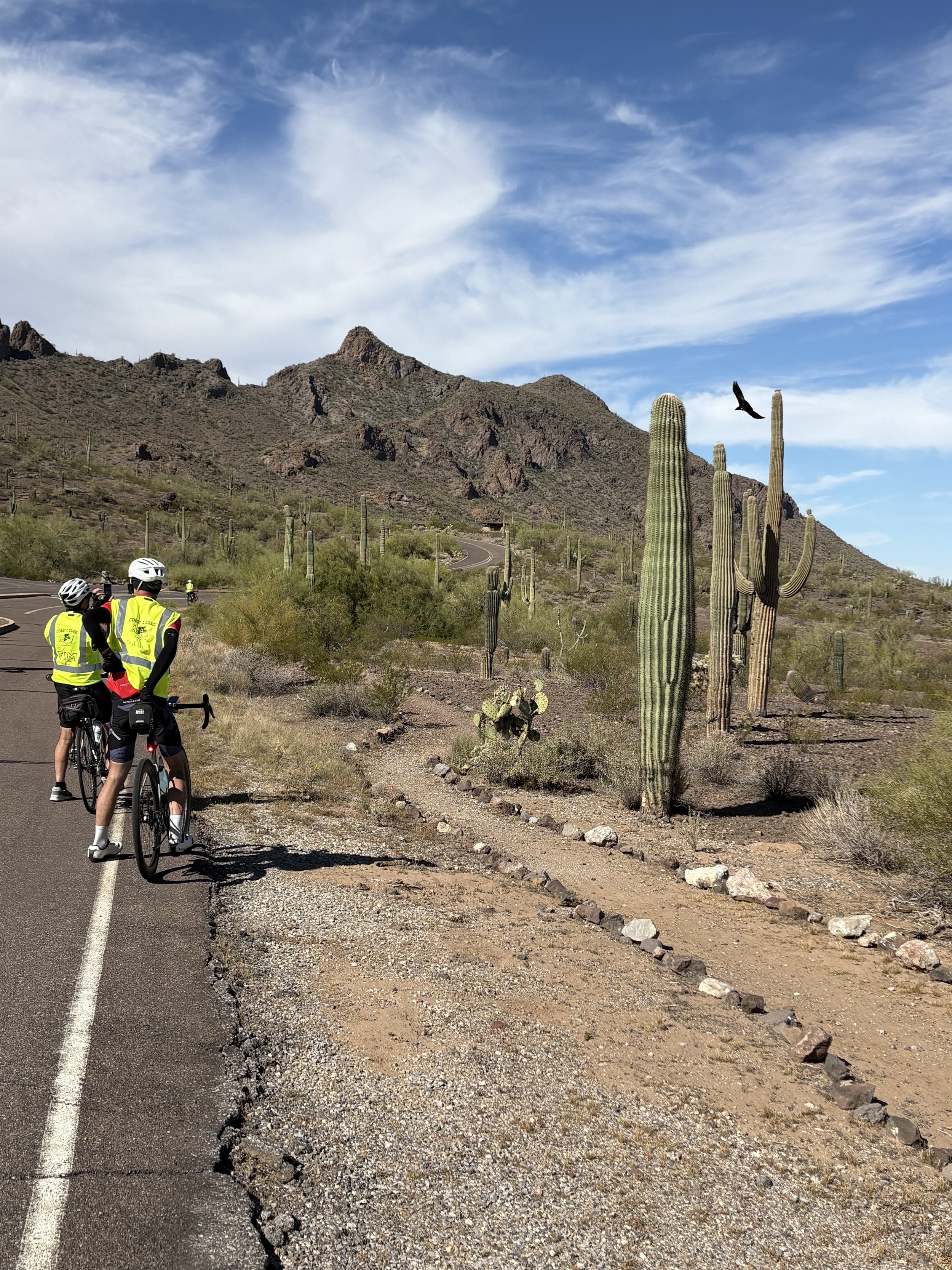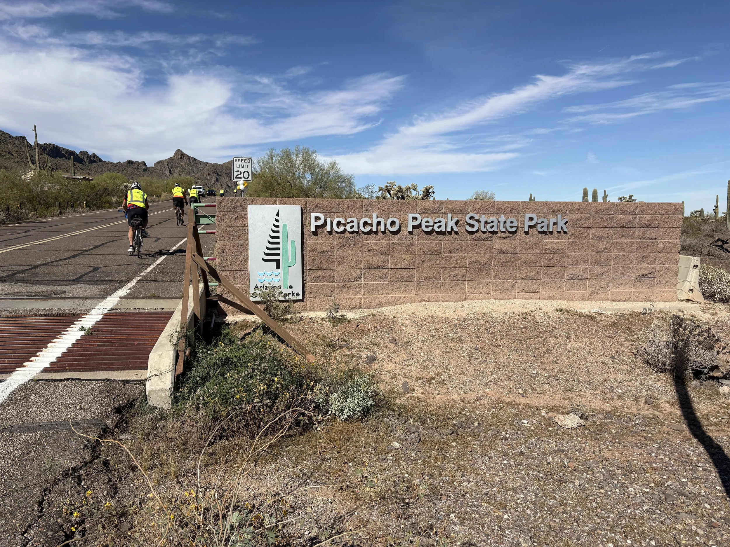 Spectacular riding day today. Left the Chaparral RV Park around 8:30, seemed windy whichever way we turned. Got into a groove as the scenery improved. Picacho State Park was a beautiful collection of elevated mountain views with big cactus. Great lunch at Nico’s Mexican food, and awesome bike trail 10 miles from our destination.
