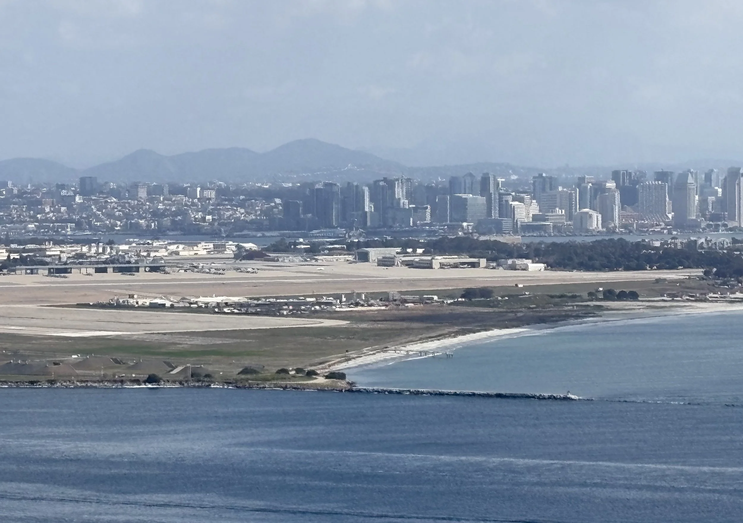 Foreground: North Island Naval Air Station & Coronado. Background: Santa Rosa & San Jacinto Mountains.